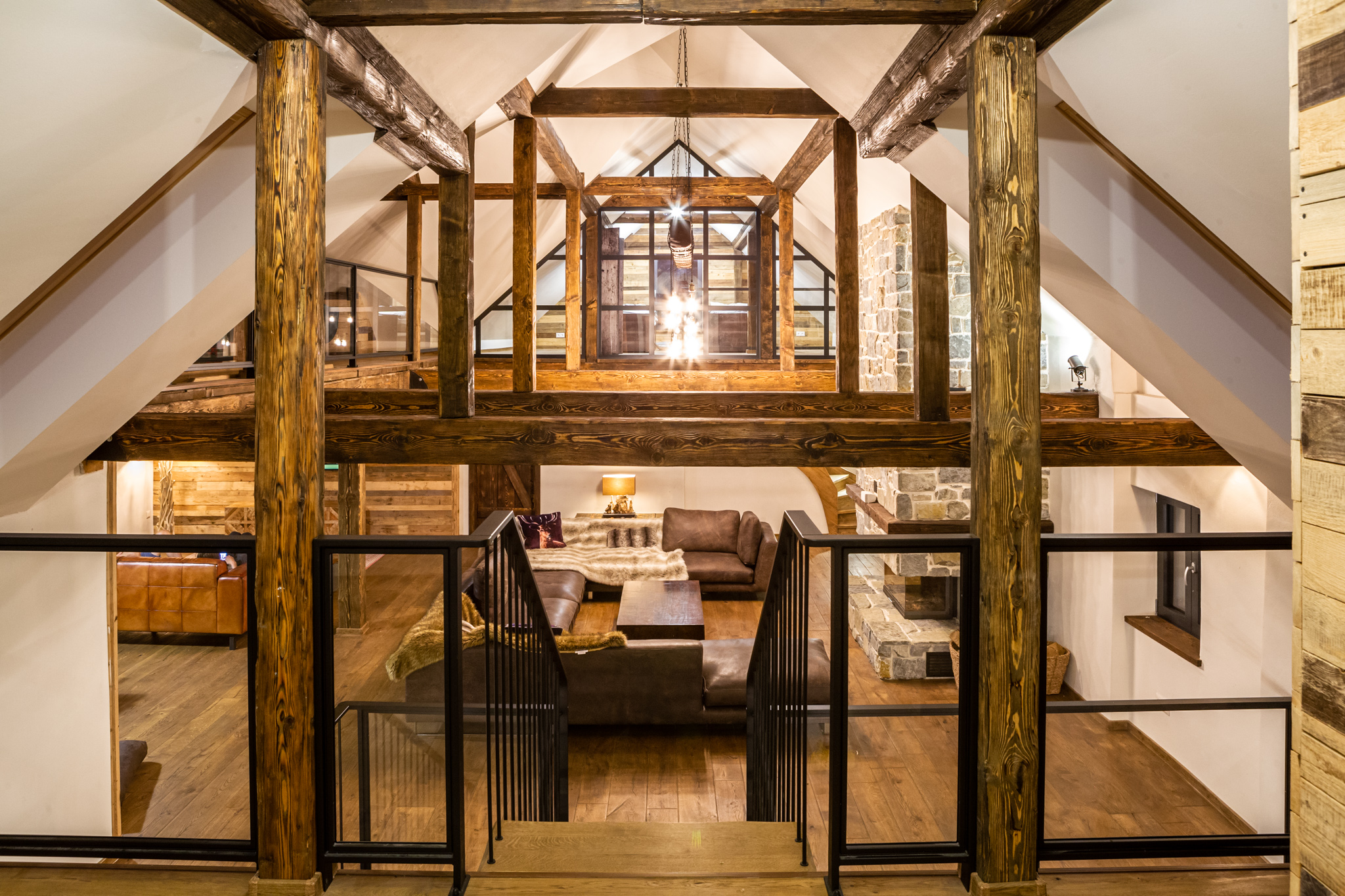 The large open plan, fully fitted kitchen and dining room complete with cosy stove is a centrepiece for bringing everyone together to share a family meal. The Living room is dominated with a tall stone fireplace and huge 12 seater sofa. With two galleries above providing space for games, reading, afternoon naps and evening gatherings.